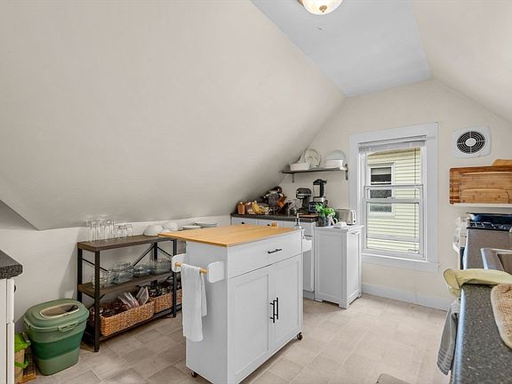 Fully applianced eat-in kitchenHardwood floorsLarge windowsVaulted ceilingsPlenty of lightSkylit white tile bathroom