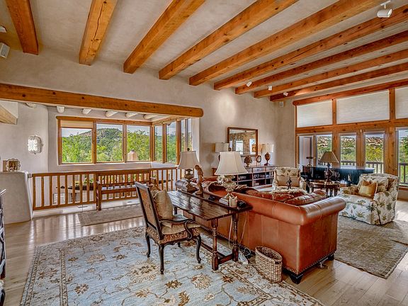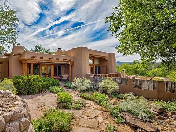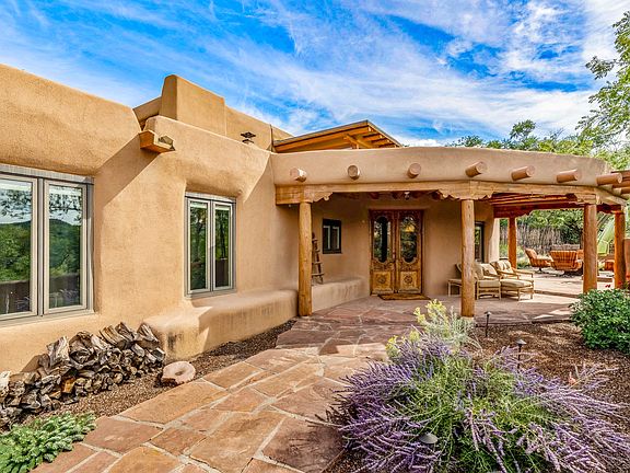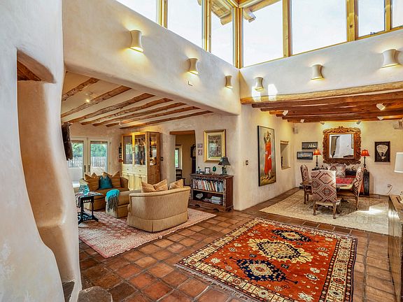 This gracious home in the Tesuque foothills has privacy and views, history and modern amenities, and is only 10 minutes from the plaza. There are multiple living rooms, seven fireplaces, two grand bedrooms suites with private outdoor spaces, and a third guest area with its own entrance. The Primary bedroom has an expansive living room, dressing room, and bathroom all on its own level with a manicured outdoor space. The guest suite was fully renovated to impeccable standards around 2007. A mix of adobe wall construction and frame construction, the home presents a blend of classic Santa Fe style with the grand scale one expects from a home of this caliber. The burbling Tesuque River runs right under the property and can be heard from the plentiful outdoor spaces, carefully designed for four season outdoor living. The home has evolved around the original structure, a circular kiva with 3’ thick adobe walls, oxblood flooring, vigas and one of the seven fireplaces on the property. You can feel the history of the Tesuque River valley through these massive walls, which the tax assessor dates to 1867, though they are perhaps a hundred years older. The intimate, cozy space of the kiva, contrasts deliciously with the soaring 20’ high ceilings of the adjacent living room. Bishops Lodge is about a mile away offering high end dining and lodging nearby. Tesuque Village market is a short mile and half trek in the opposite direction for your local needs. This home offers an ideal opportunity for all the facets of comfortable, luxurious Santa Fe living.