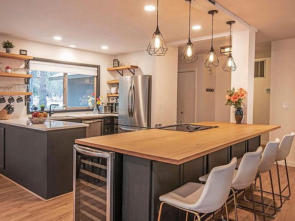 Located in a quiet cul-de-sac, this well-maintained, stylish, and charming home is nicely landscaped with beautiful Aspens, Ponderosas, and mature Pines. The wrap-around deck and paver patio offer plenty of outdoor living space. This updated and oh-so-cute 2-bedroom, 2-bathroom home with a bonus room is situated right in the heart of Sunriver. Whether your ideal day is spent at Mt. Bachelor, shopping at the Village, or even listening to your favorite podcast in front of the fireplace, you won't have to lift a finger. The two-car garage will hold all of your toys, and the expansive deck is perfect for bird watching, napping in the sun, or hosting a fun barbeque. The open-concept great room will be a hit among even your most discerning friends. Take in the stars while sitting in the private hot tub, or relax after a day of activity. This home is the perfect backdrop for your next Sunriver adventure. The first floor features a king bedroom with a walk-in closet and access to a Jack and Jill bathroom, which is also open to the hallway. There is a full bath opening to the hallway and the king bedroom. The open-concept living, dining, and kitchen area boasts a huge island and a large smart TV with cable. A slider leads to the hot tub and deck. The spacious mudroom and laundry room come equipped with a washer and dryer, and there is garage access. The garage includes ping pong and bikes. On the second level, there is a large bunk room with a twin over full bunk and an additional queen bed, as well as a king bedroom. To access the king bedroom, one must walk through the bunk room, which does have closing doors for privacy. There is a shared full bath with a tub-shower combo. The house currently includes 6 Recreation Plus Passes for SHARC, providing access to additional amenities and activities. Situated in the heart of Sunriver, this home offers easy access to Mt. Bachelor, the Village for shopping, and various outdoor activities. The neighborhood is perfect for those who enjoy a peaceful setting with the convenience of nearby attractions. This property has a no-pets policy. The house is equipped with a private hot tub and a two-car garage. The bunk room on the second level must be passed through to access the king bedroom, but it has doors for privacy.