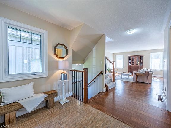 Brick homeBright foyerLarge deckNicely finished kitchenCream cupboardsCentral vac sweepStainless steel appliances