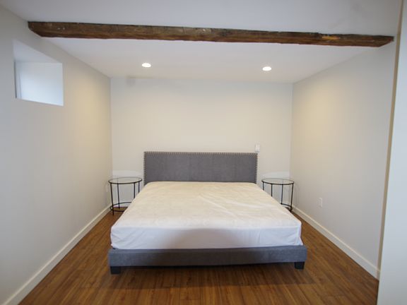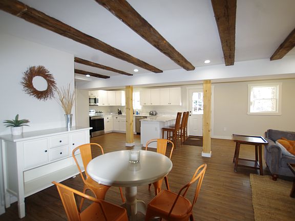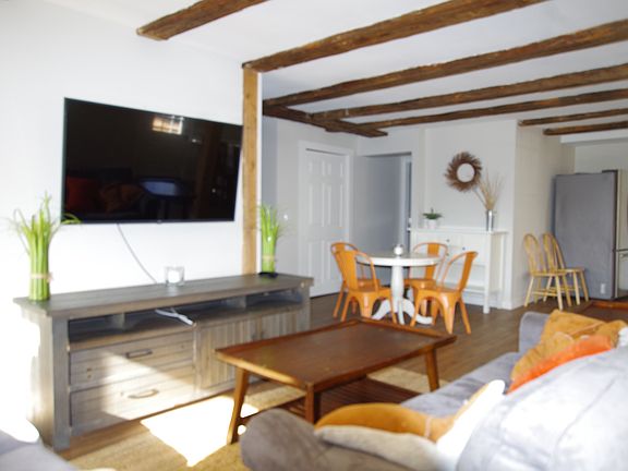 2 bedroom, 1 bathroom furnished apartment at Trow-Rico in Sunapee, Located less than 10 minutes to New London Hospital and less than 25 minutes to Dartmouth-Hitchcock. Trow-Rico is a village of cabins and apartments located in a quiet wooded and grassy area on 20 acres. The apartment boasts an open concept kitchen-living area with exposed beam and all new furniture. The kitchen has marble countertops and stainless-steel appliances. Both bedrooms have king beds, the kitchen is fully stocked and the living room has a 55 smart TV. Please note the entire apartment is furnished.