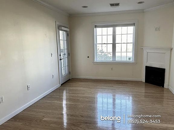 This Newburyport home features an inviting main living area with wood floors and large windows that look out over the front garden, offering a calm backdrop for everyday moments. A cozy electric fireplace provides a charming focal point for furniture arrangement and conversation. The open floor plan allows you to shape this space to your lifestyle, whether that means a reading nook, a dining corner, or room to gather comfortably.