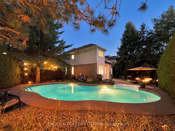 Rare opportunity to live on a quiet, low turnover street in Kanata, while offering a resort-like backyard designed for entertaining! Perfectly positioned on a premium corner lot - this home features a private tree-lined, fully fenced backyard with a 36' in-ground saltwater pool surrounded by professional landscaping that includes mature gardens, interlocking, stamp concrete and a gas BBQ hookup. The main level impresses with hardwood flooring throughout, open concept living-dining and a bonus family room with a gas fireplace and 15' ceilings. Enjoy home cooking with upgraded stainless steel appliances that include a side by side fridge and freezer (2023), Samsung Induction Stove (2020), Bosch dishwasher (2020), a large island with granite countertops and a built-in banquette. The primary bedroom is located on a separate wing upstairs with a newly renovated 4-piece bathroom and a walk-in closet. The additional 3 bedrooms are a great size perfect for kids, guests and/or a home office, along with a renovated 3-piece bathroom with a double vanity sink (2024). Enjoy cozy movie nights in your finished basement with a built-in entertainment system and gas fireplace. Or, hit a workout with a separate space for a home gym! This dream home is move-in ready and waiting for its new owners.