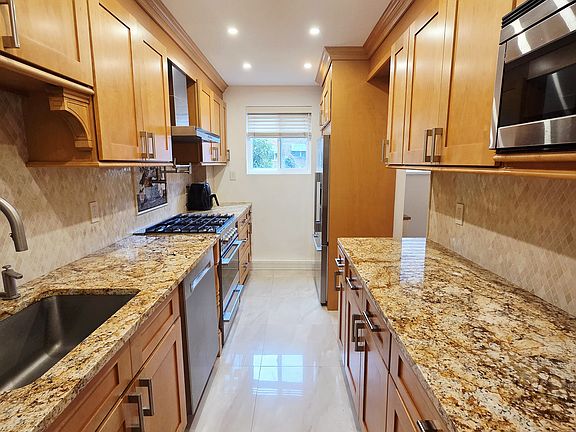 Modern kitchen with stainless steel appliances, marble counter tops, dishwasher, wall mounted hood and ample cabinetry.