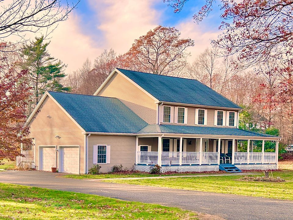 Welcome home! Experience tranquil living in this 4 bed, 2.5 bath, center hall colonial, perfectly situated on 1.77 ares of level land. A harmonious balance of elegance & comfort in the heart of desirable, Oxford, CT. The spacious wrap-around porch with swing, welcomes guests in style & often is where the party ends up, enjoying the serene evenings from a rocker. Large eat-in kitchen with granite counters, great storage, island & sliders to deck, makes an ideal set-up for summer gatherings by the above ground pool. Unwind in the spacious living room which includes a cozy fireplace & French door access to the charming front porch. Many a memory, will be made in your formal dining room! A large den, is versatile for work from home, playroom, or office. Primary features tray ceiling, walk in closet, linen closet, updated tile shower & whirlpool tub. Discover the possibilities, with the partially finished basement with new flooring, heat, a/c, ample storage & work room. This home offers an abundance of light & closet space throughout; along with hardwood flooring, enhancing its charm. Your level yard has room for sports & gardening, when you're not splashing around in the pool or eating dinner alfresco! Nestled in a vibrant community, this home is close to grocery, restaurants, schools, boutiques & golf for those seeking both tranquility & accessibility. Don't miss the opportunity to own this exquisite home, in beautiful Oxford. Schedule your showing today! 2 car oversized garage, is ALWAYS a plus for staying organized. 50 gal hot water heater, New water softening system, wifi based, 3 zone heating and air-conditioning. New pressure treated deck, fire pit area, garden shed, large level yard and lots of parking with pull through. Off driveway parking area for your boat or trailer. Convenient mud room entry. Spacious rooms, as house is deep. All and all, this home offers great flow, for your everyday living and entertaining in all of the four seasons! Quintessentially New England! You'll love your new home!