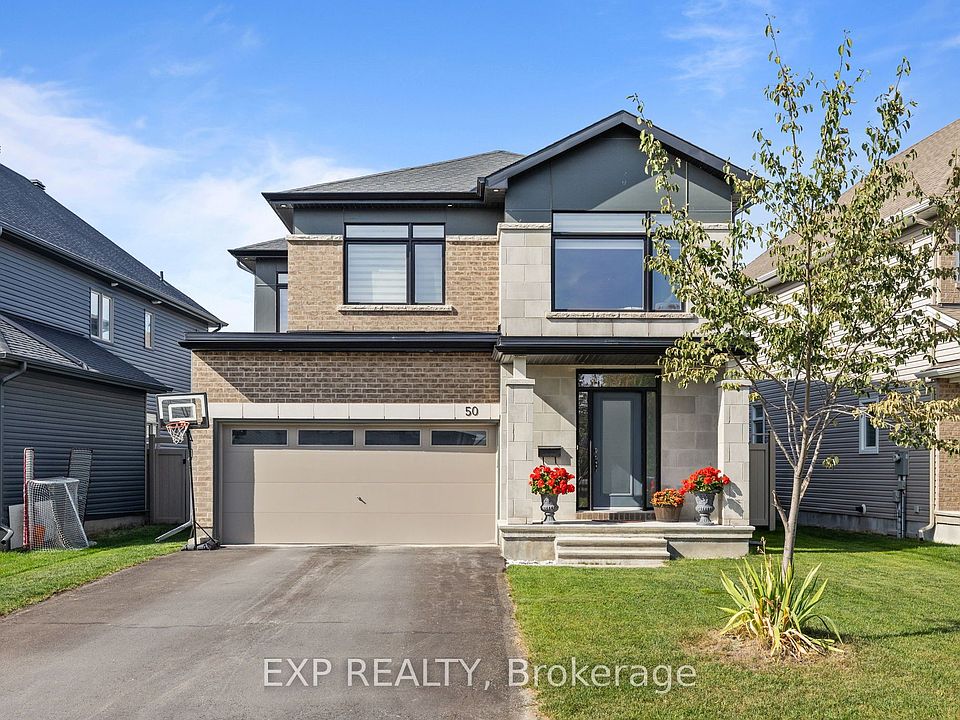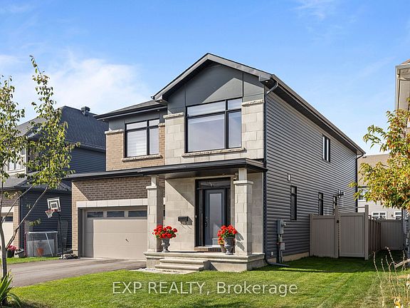 PREPARE TO FALL IN LOVE with this stunning 2020-built detached home set on a premium 45 ft X 112 ft lot, showcasing a modern contemporary elevation and upgraded with over $100,000 in premium finishes. The main floor offers a perfect blend of functionality and style, featuring a dedicated living room, formal dining area, spacious family room, and a gourmet kitchen with quartz countertops, upgraded backsplash, walk-in pantry, premium cabinetry, gas stove, and top-quality appliances. Elegant upgraded light fixtures and rich hardwood flooring flow seamlessly throughout the main level, staircase, and second-floor hallway, creating a warm and sophisticated atmosphere. Upstairs, retreat to the luxurious primary suite, complete with a spa-inspired 5-PIECE ENSUITE featuring a GLASS STANDING SHOWER, SOAKER TUB, and DOUBLE VANITY SINKS. You'll also find other THREE generously sized bedrooms, a 3-piece bathroom, and a versatile LOFT , ideal for a home office or reading nook. The fully finished basement expands your living space even further - perfect for a home gym, office, or recreation area, and includes a 3-piece rough-in for a future bathroom. Step outside to a fully fenced backyard designed for comfort, privacy, and style - an ideal space for entertaining or unwinding. All of this is just steps from scenic trails and parks, and only minutes from all the amenities Stittsville has to offer.
