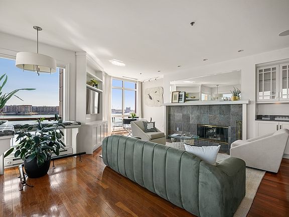 Experience unparalleled waterfront living at Burroughs Wharf in this rarely available "nose" unit—prized for its position at the very tip of the building, offering the most dramatic, uninterrupted harbor views. Spanning 1,571 square feet, this 2-bed, 2-bath home welcomes you with a private landing and interior staircase leading to an open-concept living space wrapped in floor-to-ceiling windows. Enjoy a private balcony, wood-burning fireplace, and chef’s kitchen with custom cabinetry and high-end appliances. The water-facing primary suite offers a walk-in closet and spa-like bath with Jacuzzi and step-in shower. Additional features include in-unit laundry, hardwood floors, recessed lighting, and garage parking. Burroughs Wharf offers 24-hour concierge, marina access, and impeccably landscaped grounds—all moments from the North End, Seaport, Greenway, and major transit.