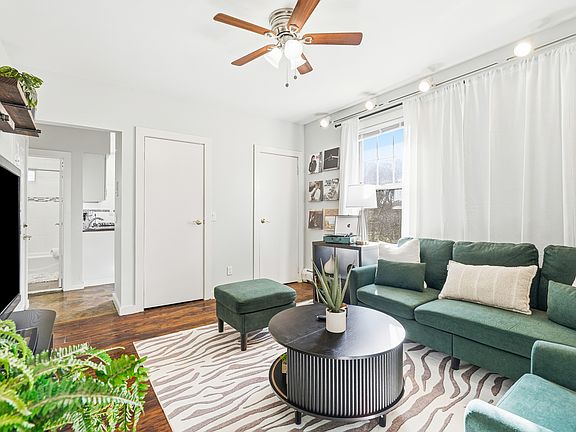 The bright living room features warm wood-look floors, a large window, and a ceiling fan that keeps the space airy and inviting. Thoughtfully chosen furnishings for your comfort, a plush green sofa and chair, a modern round coffee table, TV console, and artwork create a clean, designer feel from the moment you walk in.