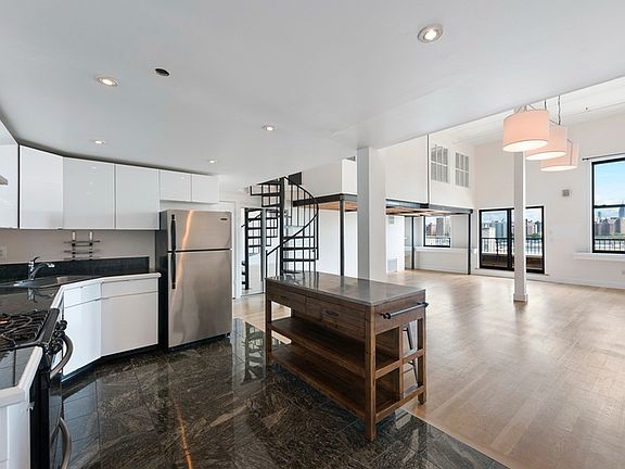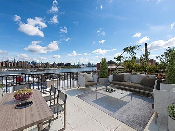 Introducing a spectacular Penthouse triplex loft with 2 private terraces and stunning skyline views of Manhattan. The first floor of this unique loft boasts over 14' ceiling heights and an open-concept kitchen, living and dining space with oversized windows and one of two private terraces. A cast iron staircase leads you to a massive open mezzanine level with an additional bonus bedroom. One more flight up to a gracious master bedroom and ensuite bath, featuring 12' ceilings, tons of light and a 500 square foot private terrace, perfect for enjoying breathtaking sunsets over the East River, Manhattan & Williamsburg bridges, and the Empire State building. Move in as is or customize to suit your lifestyle. Please note the apartment is a loft as per the offering plan but is currently configured with 2+ bedrooms. 50 Bridge Street is a prewar condominium located on the quiet cobblestone streets of the most sought after waterfront neighborhood in Brooklyn, DUMBO. This building is pet friendly and offers a doorman, live-in super, basement storage, bike room, private parking garage, commercial-grade laundry room, and a roof deck. Conveniently located just a few short blocks to the F (York Street) & A/C (High Street) Subways, Wall Street Ferry & Citibike stations. Steps to chic restaurants, shops, art galleries, the new Empire Stores & Brooklyn Bridge Park.