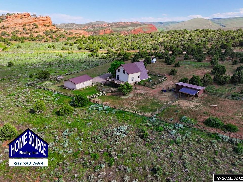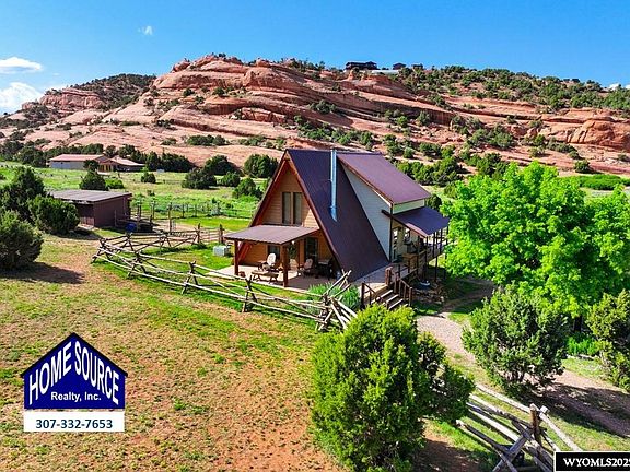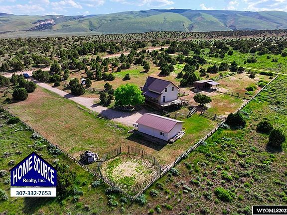 Welcome to 50 Bristlecone, a sweet, incredibly clean, renovated and well-maintained home with a large 30’x24’ garage, 2-stall enclosed barn, complete fencing and 2.56 stunning acres tucked into the beautiful Red Canyon area of the Wind River Range! This home has a prime location, situated in solitude with a stunning backdrop of red rock cliffs, natural caves, petroglyphs and rock outcrops and has private access to 230 acres of Bureau of Land Management property, giving you an abundance of recreational opportunities to hike, backpack, climb, mountain bike or ride horses from your own neck of the woods! Additionally, the home being tucked into the rock bluffs and junipers provides an unmatched, private retreat for your rural Wyoming lifestyle. You'll immediately feel at home stepping into the bright, impressive and inviting family room. The construction design with floor to ceiling windows enables you to gaze out onto the mountain and red cliff views. This home has a grand living room, large dining room and sizable kitchen all serving as one impressive gathering area! Details such as tongue-and-groove finished pine ceilings, wood stove, new front windows, tankless water heater, added insulation and new siding on the full front of the home add to the comfortablable and energy efficiency this home offers. The living is easy, maintenance simple, utilities affordable, and the temperature comfortable year-round with central heat and air. The pristine kitchen has tastefully refinished, whitewashed wood cabinets and beautiful epoxy finished counters with breakfast bar and pantry space. You’ll love the main-level primary bedroom with private on-suite bathroom, custom tile that surrounds the garden tub and shower, matching the custom tile and lodgepole vanity and mirror. The primary bedroom also has private deck access off the backside of the home so you can enjoy the evenings stargazing the peaceful skies. Upstairs there’s an additional two bedrooms with a full Jack-and-Jill bathroom. Even though the upstairs bedrooms are spacious they manage to boast the charm with angled ceilings, sweet nooks and darling spaces that add a cabin feel. The garage has a 20’x 24’ double car parking space with automatic overhead doors, plus has a 10' x 24’ separate workshop with power. The homeowner has made considerable investment in the exterior infrastructure items that make this home turnkey for those who love animals; it is a complete ranchette with quality wood perimeter and cross fencing, two-stall enclosed barn with overhang and power and new concrete patio. The wraparound deck is a wonderful place to sit and watch the abundance of antelope, deer and elk you will see roaming around the subdivision. This home is a perfect combination of rustic and renovated, it’s warm and traditional in its finishes, quality in its construction and being offered mostly furnished to make your move easy. If you are looking for a beautiful, private setting, public land access, a turnkey home with a large garage, fencing and barn and all within 20 minutes from the charming and vibrant town of Lander, Wyoming then this one's for you!