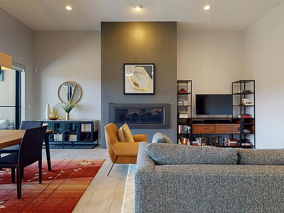 Contemporary style compliments this light and bright home newly built in 2018. The 3 bedroom 2.5 bath house is single level with no steps, has comfortable in-floor radiant heating and cooling, has an easy to live in split floor plan, oversized garage, gas fireplace, and best of all, sits tucked in at the end of the street providing a sense of privacy. Sangre De Cristo views are framed by the large windows and sliding doors in the living/dining area opening onto the back portal perfect for indoor/outdoor entertaining. High ceilings and open spaces with a flowing design adorns the home with state-of-the-art kitchen, butler's pantry, long center island with seating, stainless steel appliances, and a breakfast nook that can be used as an office, or extra sitting area. The master suite features dual walk-in closets, and a spectacular bath, while the 2 guest bedrooms share a Jack-and-Jill bath with separate sinks and closets. Enjoy being in beautiful, established Aldea with clubhouse, tennis, and gym while being minutes away from downtown. This is the whole package! Welcome home!