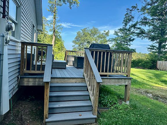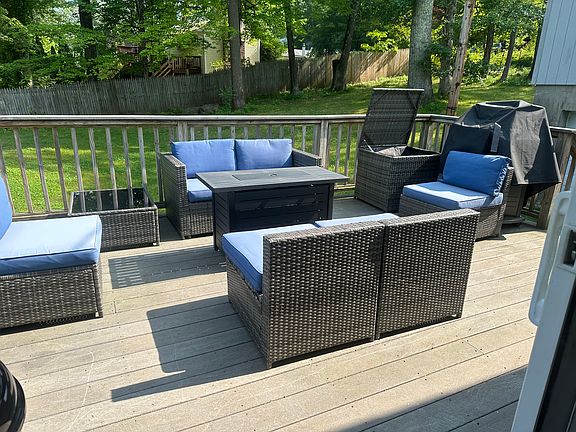 The open floor plan leads out to a furnished deck for outdoor enjoyment. This large spacious property is yours for outdoor games and activities.