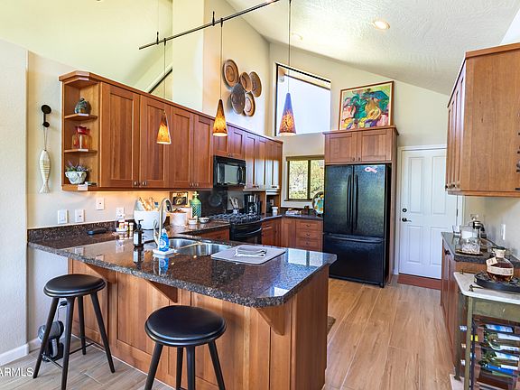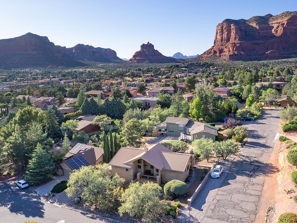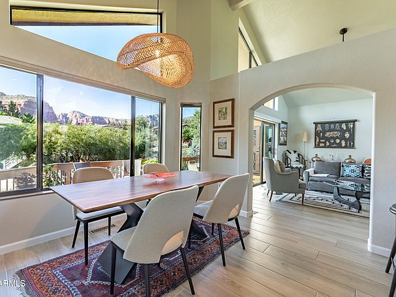 Welcome to the panoramic Red Rock views in Village of Oak Creek residence. This 3-bedroom, 2-bathroom home boasts expansive decks that invite outdoor living and relaxation. Meticulously remodeled in 2023/2024, the home features cathedral ceilings and an open floor plan with new porcelain tile floors, designer interior paint, plush carpet, updated guest bathroom, and new lighting and ceiling fans throughout. Enjoy the spacious two car garage with an additional storage room and wine cellar. The exterior of the property has been extensively landscaped and fully irrigated to create a private oasis.