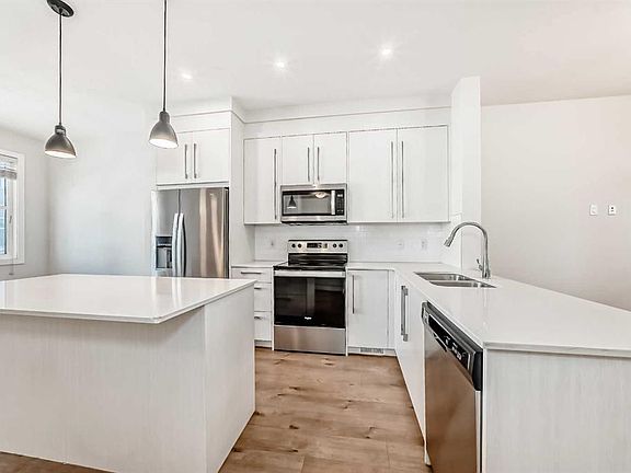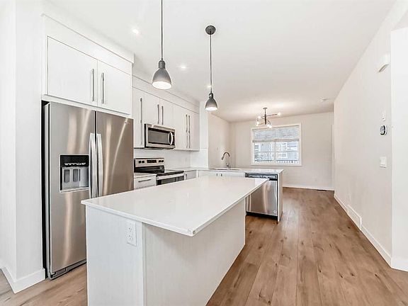 Welcome to this End-Unit, East-Facing Townhome located in the growing community of Cornerstone NE. Built in 2022, this modern and well-maintained home offers 3 bedrooms, 2.5 bathrooms, and a double attached garage, making it a perfect choice for families, first-time buyers, or investors. The main level features a bright and open layout with large windows providing plenty of natural light. The kitchen offers modern stainless steel appliances, stylish cabinetry, and a functional dining area—ideal for everyday living and entertaining. Durable vinyl flooring runs throughout the main spaces for easy maintenance. Upstairs, you’ll find 3 generous-sized bedrooms including a comfortable primary suite with its own ensuite. The home also includes in-unit storage, upper-level laundry, and thoughtful interior design to maximize convenience and comfort. This property offers two access points (East and West entrances) for added practicality and ease. One of the best features of this home is the low condo fee (less than $180/month), adding incredible value to this well-located townhome. **Situated right beside public transit** and close to parks, pathways, shopping, schools, Stoney Trail, Calgary Airport, and CrossIron Mills, this location is ideal for convenient living.