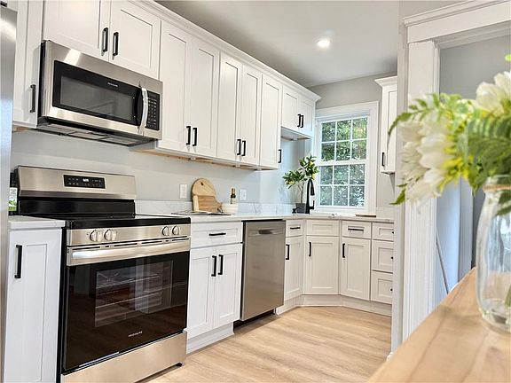 This beautiful home has timeless character and modern improvements! Discover the perfect blend of classic charm and contemporary updates in this property that offers ample comfortable space. Step onto the welcoming front porch and enter into a bright and inviting main level, where freshly refinished wood floors and stately columns create a warm, sophisticated atmosphere. The open-concept features two cozy living areas separated by stately columns, and a spacious eat-in kitchen with granite countertops, stainless steel appliances, and ample cabinetry. Upstairs, you’ll find two of the homes three generously sized bedrooms with large closets for clothing and storage. The finished, heated basement has a half bathroom and laundry area, adding more valuable room that’s ideal for an office, gym or playroom. Outside, enjoy your own private backyard oasis with brand-new landscaping and a detached two-car garage. This move-in-ready home truly has it all — it’s just waiting for its next owner!