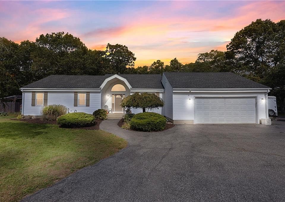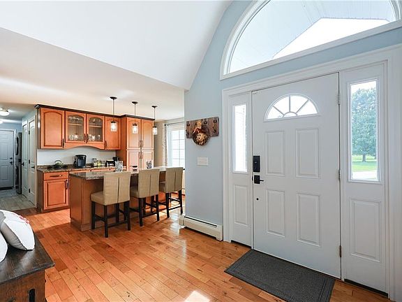 This inviting home combines classic charm with modern updates, set on a private 2.85-acre lot at the end of a quiet road. The living room showcases cathedral ceilings, hardwood floors, exposed beams, wainscoting, and a stunning stone fireplace with mantle that opens to a spacious covered porch, perfect for entertaining or relaxing. The kitchen features floor-to-ceiling custom maple cabinets, stainless steel appliances, and a center island connecting seamlessly to the formal dining room. The primary suite offers a cedar closet and full bath, joined by two additional bedrooms and another updated full bath. A finished basement adds living space with a pellet stove, beverage bar, and abundant storage. Enjoy peace of mind with a new roof (March 2025), newer oil tank, and included washer, dryer, window A/Cs, and portable generator. Complete with a two-car garage, this property delivers both comfort and convenience in a beautiful natural setting.