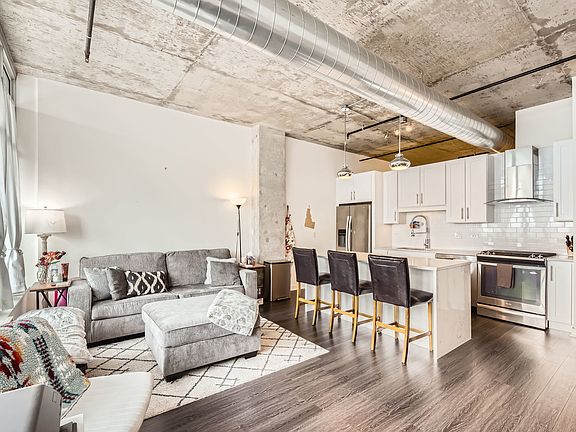 Loft style primary bedroomOverlooking the balconyHigh ceilingsLarge south facing windowsIn unit stackable laundryNatural lightOpen kitchen