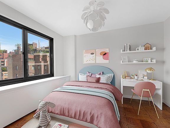 The expansive living room is framed by floor to ceiling windows that showcase delightful Carnegie Hill views. You will enjoy ample space for both living and dining, in a bright, open format. The separate kitchen is outfitted with custom framed glass cabinetry and stainless steel appliances. The king-sized primary bedroom features generous built-in bookshelves and closets, and a full en-suite bathroom. Additional closets are thoughtfully positioned throughout the home, providing ample storage.