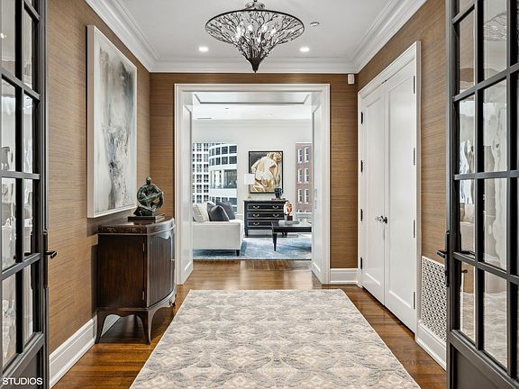 The elevator opens directly into this full floor, 3900 sf home that has been designed to perfection and ready to move right in. Offered fully furnished (or not) - this home lives like a quiet oasis in a sea of possibilities. The finishes are extraordinary using textures, contrast, lighting and walls ready for your art collection. Ceilings are 10' with a glass curtain of south-facing windows spanning 64' all featuring Lutron blinds. The kitchen is right out of a magazine with gorgeous, rich alderwood cabinetry along with Subzero and Wolf appliances. Flooring includes a marble entry with hardwood throughout. This is not your typical floorplan for the building - it has been brilliantly reconfigured to create huge closets in the primary suite, an en-suite bedroom/den in the SW corner, office space and stunning steel and glass door entry. Located on the 7th floor, you feel connected to nature with treetop views while surrounded by urban architecture such as the steeple atop St. James Chapel. Large terraces facing both east and west allow quiet moments outdoors to greet and end your day! Wired for sound and including 1 parking space, this is a must-see home in the heart of it all. Additional parking steps away.