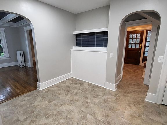 Modern fixturesStylish wallpaper accentsStainless steel appliancesNeutral modern paint colorsHuge foyerSubway tileFormal dining room