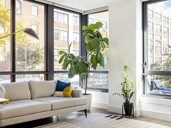 Welcome to Residence 2B at 50 Greenpoint Condominium — an exceptional, light-filled corner home offering sweeping views of the leafy neighborhood and a glimpse of the East River through dramatic floor-to-ceiling windows. A private parking space within the building is also available.