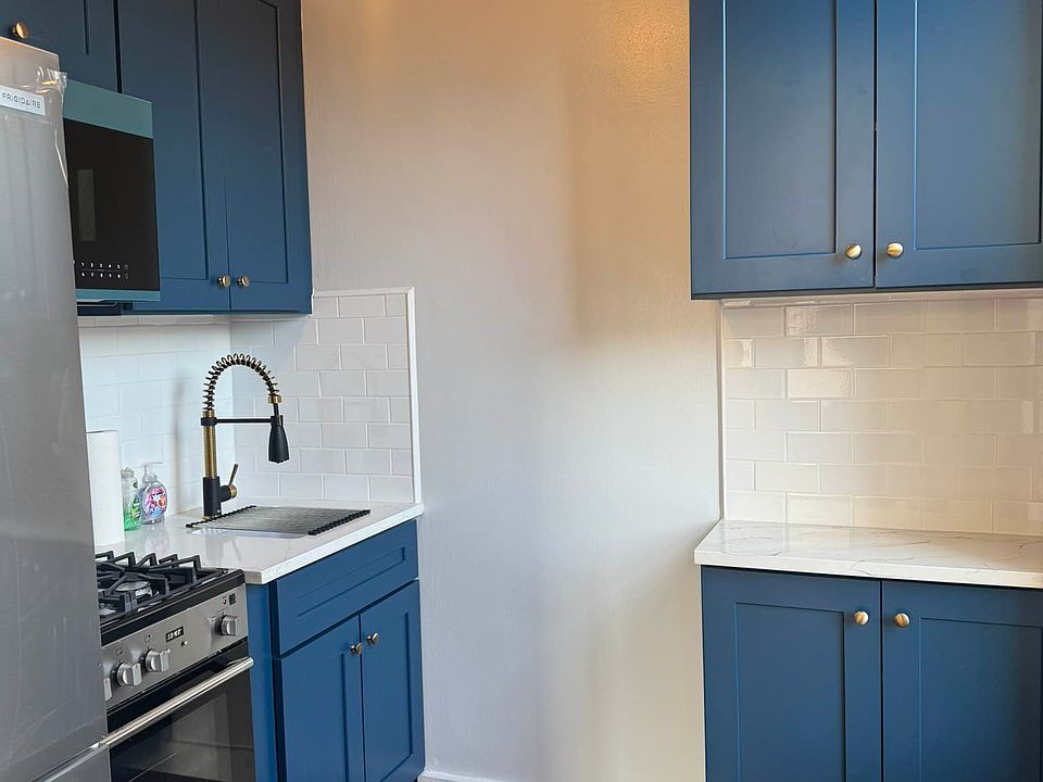 Marble fireplace mantleHigh ceilingsCharming alcove studioWood floorsRenovated kitchen