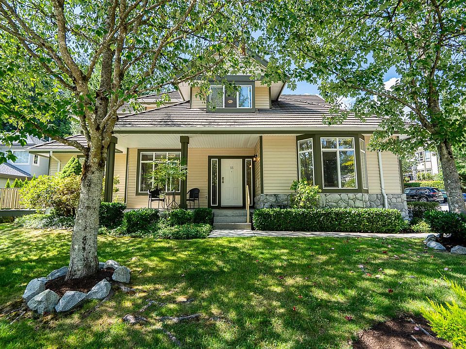 Discover this unique Port Moody end unit townhome with SINGLE-FAMILY HOME FEEL and incredible privacy! Situated in one of the most desirable communities, this 3 bed plus den, 3 bath home has an excellent layout with timeless updates. Crown molding and marble floors on the main with large bright windows throughout. Beautiful, newly updated kitchen. Dining leads to a sunny patio overlooking the yard. Beautiful living room plus a separate spacious family room w/gas fireplace. Den/office is perfect for work from home. 3 generous beds, primary has 5-piece ensuite and walk-in closet. Spacious foyer, welcoming covered front porch, double side by side garage. Sought after school catchment, 5 minute walk to Heritage Woods Secondary & Eagle Mountain Middle, steps away from Bert Flinn Park's Trails.