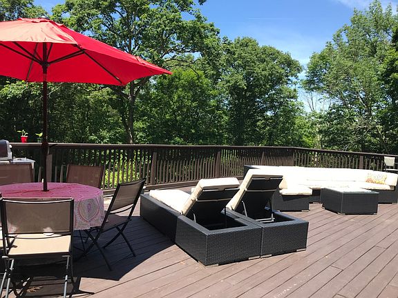 Enjoy views of nature from every room. Has a great backyard pool, extensive stonework on property, and huge wraparound deck on a completely private and sunny property. Open inviting floor plan with walls of windows; modern kitchen with granite counters and stainless appliances; great wood burning fireplace in the family room; office; separate rec room for kids; and sunroom off the deck. To rent furnished or unfurnished. Landlord to pay to: close pool 2019, for Fall & Spring property clean-ups, and annual boiler service. Tenant pays all utilities, oil, snow removal, lawn maintenance. Tenant pays for opening and maintenance of pool if chooses to open it in 2020.