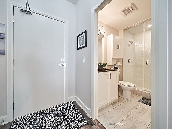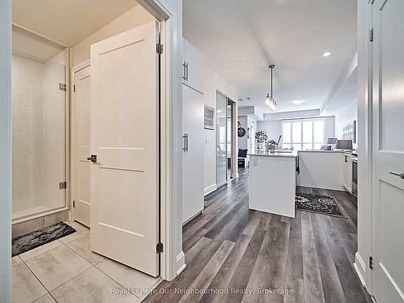 Welcome to your dream lakeside retreat - a beautifully designed, open-concept condo that effortlessly blends contemporary elegance with the serenity of waterfront living. Nestled right on the shores of the lake, this sophisticated residence offers breathtaking, unobstructed views from the moment you step through the door. This stunning unit features a spacious, light-filled layout with high ceilings, clean architectural lines, and expansive windows that invite natural light throughout the day. The open-concept design creates a seamless flow between the living, dining, and kitchen areas, making it perfect for both entertaining and everyday living. The gourmet kitchen is a chefs dream, boasting sleek quartz countertops, custom cabinetry, and high-end stainless steel appliances. Whether you're preparing a casual breakfast or hosting a dinner party, the oversized island provides both functionality and a stylish focal point for gatherings. Adjacent to the kitchen, the dining area flows effortlessly into a large living space that opens directly onto a private balcony - the ideal spot for your morning coffee or evening glass of wine as you take in panoramic lake views. The primary suite is a peaceful sanctuary, ample closet space, and a spa-inspired ensuite bath complete with an upgraded walk-in glass shower, and contemporary finishes. Wake up each morning to the gentle shimmer of the lake outside your window and fall asleep to the soothing sounds of nature. Additional features include engineered hardwood flooring throughout, in-unit laundry, custom closet unit, and climate-controlled comfort year-round. The building itself offers a full suite of amenities, including a fitness center, lounge areas, and secure underground parking, and a large storage locker. Ideal for professionals, downsizers, or anyone seeking a low-maintenance lifestyle without compromising on style or location, this turnkey property offers more than just a home - it offers a lifestyle