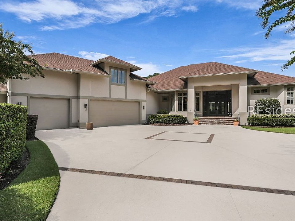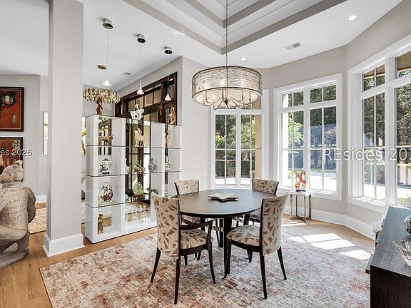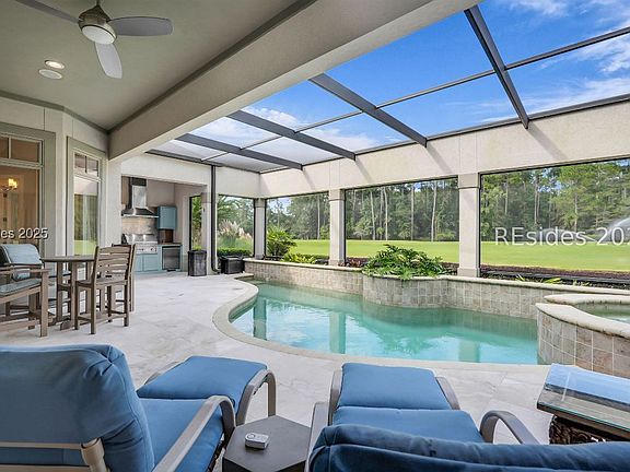 This stunning modern-transitional home is perfectly situated on a prime water and golf view homesite, offering elegance, comfort, and exceptional upgrades throughout. The heart of the home is the grand great room, highlighted by soaring tray ceilings and a custom-designed movie theater focus wall with a lighted mantle and built-in surround sound speakers. Just beyond, the screened lanai invites you to relax with its crystal-blue dipping pool, spa, cascading water feature, and fully equipped outdoor kitchen creating a true Lowcountry oasis.The chefs kitchen combines style and function with a Fulgor Murino induction cooktop, Thermador appliances, a spacious island, and an adjacent breakfast nook overlooking the lagoon. A formal dining room provides an elegant setting for entertaining. The home also includes a large office with custom removable bookshelves and wide windows that capture the morning sun and tranquil lagoon views.The owners suite is a spa-like retreat featuring a walk-in shower, dressing table, bidet, and abundant natural light. Two generous guest suites are located on the first floor, while a bonus room over the garage provides flexibility for a fourth bedroom or media space. A dedicated media closet with in-wall cabling is already in place to support a state-of-the-art home theater.Additional details include plantation shutters throughout, a wet bar with in-cabinet wine racks, and a spacious two-car plus golf cart garage with epoxy flooring, cabinetry, sink, and a Gladiator track system for bikes and gear.3M film on all windows applied 2003 for UV and hurricane protection. The home also offers easy walk-in attic access, spray-foam insulation for efficiency, and beautifully maintained landscaping that enhances its curb appeal.Every detail has been thoughtfully designed, from upgraded fixtures and stunning wood floors to the seamless blend of classic elegance and modern luxury.2024 property taxes for resident were $6750.