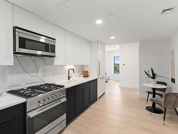 Building amenities include: private work pods, high-end fitness room, elegant resident lounge connecting to the common roof deck with sweeping views, pet wash, dog run & package room w/ refrigerated grocery storage. Attached parking garage available.