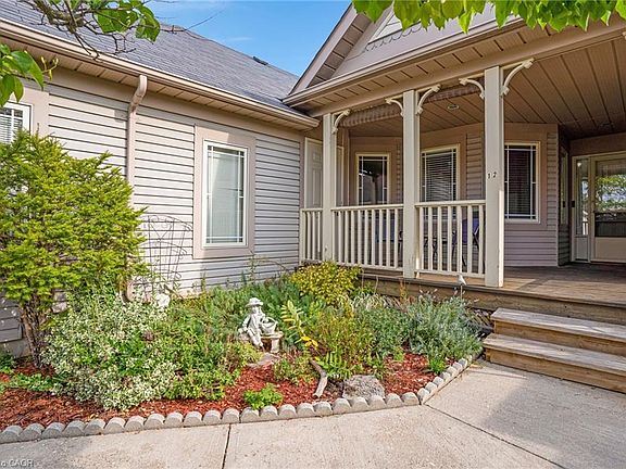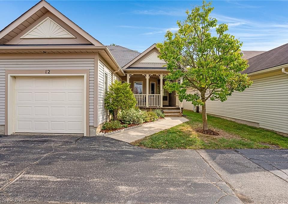 Welcome to Livingstone Circle - ADULT COMMUNITY for ages 55+, located in Kitchener's Stanley Park neighbourhood. The Cottages of Livingstone Circle are spacious bungalows with garages on leased land. Unit 12 is a bright 2 bedroom bungalow townhome with 3 baths that is newly updated and is move-in ready. Gorgeous hardwood and fresh paint throughout the main floor. The kitchen has gorgeous maple cabinetry and was recently renovated. The primary bedroom is generous with walk in closet and vaulted ceiling. The main 4 pc bath has been updated with quartz countrs, heated flooring, jetted tub and rain water shower. The large partially finished basement offers plenty of potential and storage while the 2 piece baths both in the basement and main foyer add convenience. The homes location offers quick access to many amenities, parks and open spaces. Enjoy maintenance-free living. Residents can enjoy access to The Cottage community centre for social gatherings and activities. Relax on the covered front porch or back deck where its very private with no rear neighbours. Take a moment to view marketing video and the other photography showcasing the home.