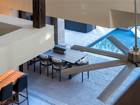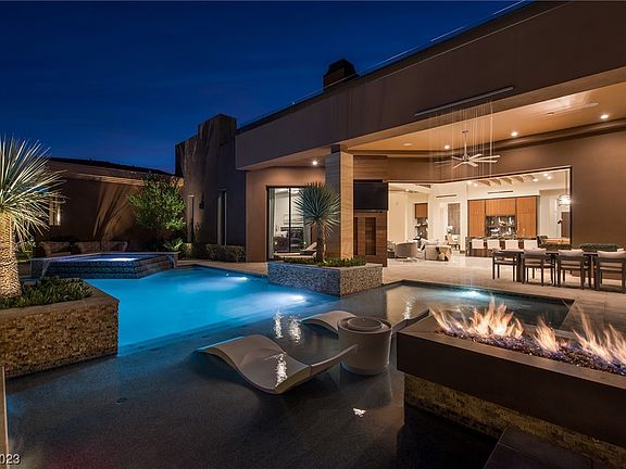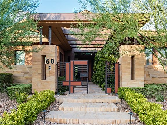 This Ridges Azure home lives like a single-story; the primary suite’s rotunda entry opens to stunning marble-wrapped fireplace, spa style bath, steam shower & gym; guest quarters w/private entrance & garage, all on main level. The home, w/4 car garage, sits on corner lot w/front elevation clad in rich sandstone creating exceptional curb appeal. Walk thru gates & lush entryway to pivoting front entry door opening to foyer w/13’ ceilings over the living room, kitchen & back-lit onyx bar; w/marble & limestone flooring. The motorized pocket doors open to the shell stone terrace that surrounds the pool/spa & outdoor kitchen. Pool has rain waterfall into pool’s wet deck that wraps around fire pit. All-Thermador kitchen w/ Zebrawood cabinetry, marble countertops & Control-4 smart home automation. Upper-level left is Bedroom #4 as an entertainment lounge w/full bar & ¾ bath, large screen TVs, & balcony w/ mountain views; upper-level right opens out to large balcony w/fireplace & Strip View.