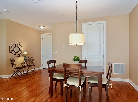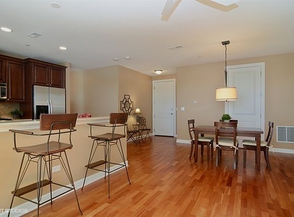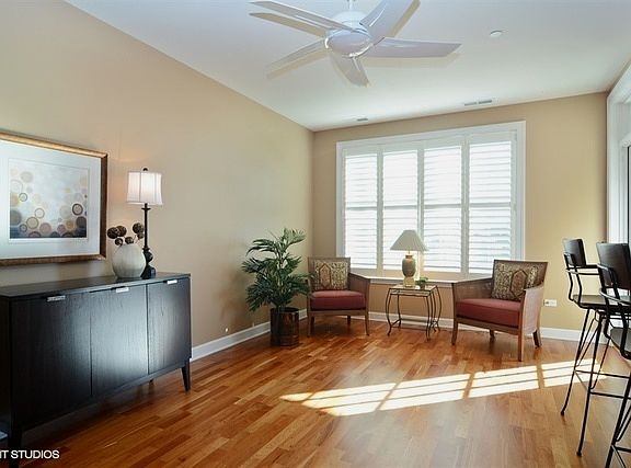 The pictures represent the possibilities of decorating this unit. The house is vacant and ready to move in. This is a classy building right in downtown Palatine. It has a welcoming lobby. The unit itself is updated and has many great features including heated floors, ceiling fans and a California closet. All windows have PLANTATION SHUTTERS. The kitchen has cherry cabinets with roll out shelving and stainless steel appliances, marble counter tops and a stone back splash. Kitchen space matters and this one is a nice size. The laundry is in the unit with cabinets and a storage closet. There is a storage space on the 2nd floor. There is UNDERGROUND PARKING. Building is conveniently located. EASY ACCESS TO TRAIN, RESTAURANTS, GROCERY SHOPPING AND SHOPS. Take a stroll and enjoy the feel of a small town.