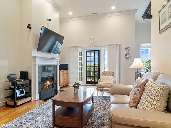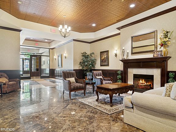 One of downtown Palatine's most luxurious iconic condo buildings, the Providence, has just one luxury unit for sale, and this it! Corner unit with lots of light, 13 foot ceilings throughout, gourmet kitchen with 42" cabinets, granite countertops, large island for seating. The spacious primary suite has a well-appointed bathroom and large walk in closet. Designed as a large two bedroom, previous owner converted second bedroom to richly custom finished dining or family room. Beautiful built in bar and buffet with custom cabinets, marble countertops, wine storage, Sub Zero beverage refrigerator, and freezer drawers create a custom entertainment hub. (Could be easily converted back to second large bedroom). There is a small office presently used as a second bedroom adjacent to a second full bathroom. This unit has been updated with high end commercial grade appliances, large laundry room, canned lighting, gas fireplace and hardwood floors throughout. Entertain with Bose surround sound speakers and private outdoor patio including hook ups for television (with mount already installed) and a natural gas grill. There are two dedicated parking spaces with storage lockers in the building's heated garage. Enjoy walking to fabulous dinning, bars, shopping and the Metra train station, just outside your door. Building amenities include a party/meeting room and spacious terrace, a perfect place for entertaining. Secure building. HOA dues cover water, sewer, natural gas, internet and cable - all but electricity.