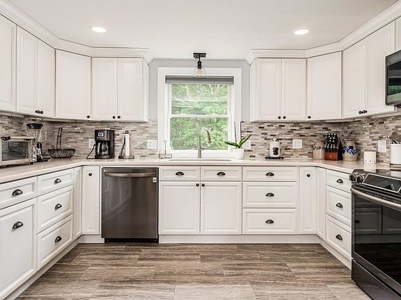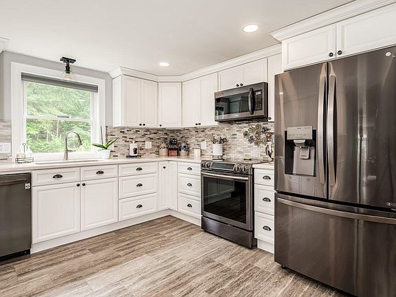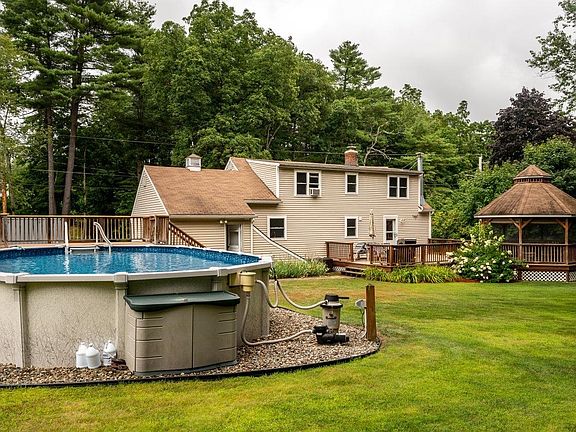 Welcome to this move-in ready cape, perfectly situated near the MA border. This charming home features an updated kitchen with white cabinets, Corian counters, and stainless steel appliances, open to the dining room for easy entertaining. The large front-to-back living room boasts a cozy pellet stove, built-ins, and access to a spacious deck overlooking the beautiful backyard. Beautiful hardwood flooring, updated windows, and versatile up/down shades with both light-filtering and room-darkening options. The main level includes a full bathroom with laundry, tile flooring, and a bath with Swanstone surround. Upstairs you'll find two generously sized bedrooms and a half bath. The finished lower level offers a versatile rec room with a built-in bar, perfect for a media or playroom, plus additional storage and a workshop area. Enjoy outdoor living on the front farmer's porch, large back deck, by the fire pit or in the screened gazebo. The backyard is a true oasis with mature landscaping, peach tree, dedicated garden space, and an above-ground pool with a surrounding deck. Located in the Timberland School System, this home offers a convenient location close to shopping, amenities, and major commuter routes. Don’t miss your chance to see this gem! Showings begin at the Open House Friday 8/9 from 4-6, Saturday 8/10 from 10-12, and Sunday 8/11 from 12-2.