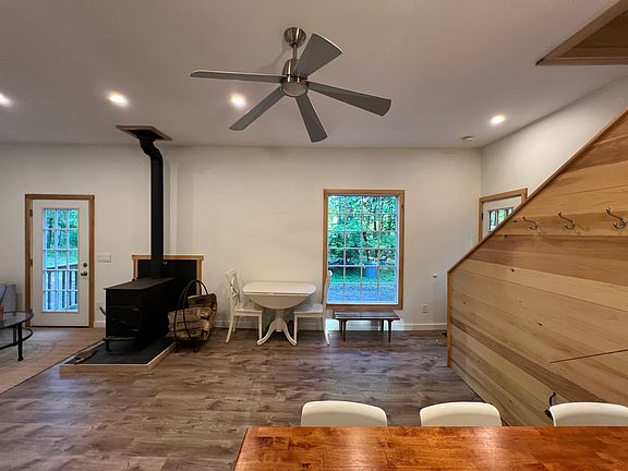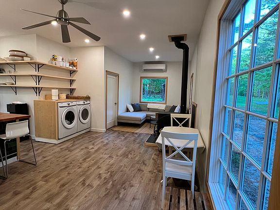 Charming fully furnished 1200 sq. ft. home with 2/3 bedrooms 1.5 bath. Home has an extra den/office area outside of the primary bedroom complete with a desk and daybed. The private 2.29 acre parcel is located in the quiet Blue Mountain area of Saugerties, NY. Property is owned and maintained by a local licensed contractor. The home recently had a complete interior/exterior renovation. New windows/doors, roof, interior/exterior paint, appliances, HVAC systems, water filtration system, wood stove and balcony deck off of primary bedroom. New wood paneling, shelving and built ins throughout. Exterior includes fire pit, pond, expansive lawn areas, woods, and plenty of parking. Close proximity to some of upstate New York's finest hiking trails, swimming holes, lakes, golf courses, Hunter, Belleayre and Windham Ski Mountains as well as many other outdoor activities. Ten minute drive to Woodstock and Saugerties Villages, twenty minutes to the city of Kingston all offering a wide selection of restaurants, grocery and retail shopping.