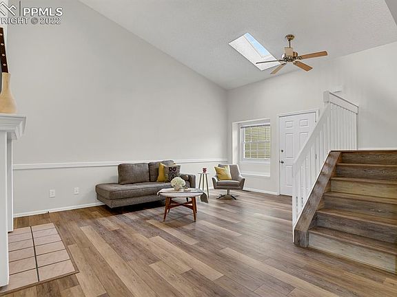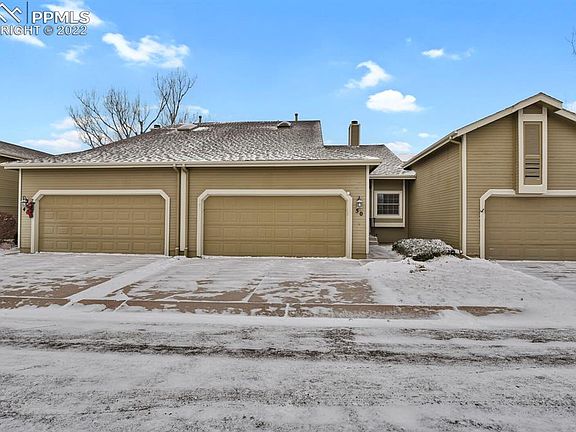 This well maintained townhome is located in the coveted Gleneagle neighborhood with easy access to I-25 & close proximity to the Air Force Academy. This property has two bedrooms, two bathrooms, an attached two car garage, close to 2,300 total sq ft, & room to expand in the unfinished basement. When you walk-in to this beautiful home you will be greeted by the vaulted ceilings, new flooring, brand new interior paint, skylights, & an open floorplan. The living room features a wood burning fireplace, mantel with tile surround, & opens up to the dining area. The dining area is open to the kitchen & has sliding glass doors that lead out to the private fully fenced in patio area. The gourmet kitchen has been tastefully remodeled with custom cabinets, crown molding, soft close, granite counter-tops, pendant lighting, undercabinet lighting, Carrera marble backsplash, stainless steel appliances with smooth-top range, overhead microwave, french door refrigerator, dishwasher, hardware, & fixtures. There is a main level bedroom that could be used as a second primary & has a sliding glass door that opens up to the patio. The upper level primary bedroom has a sliding glass door that leads to a deck that overlooks views or Pikes Peak & the stunning Colorado front range mountains. The bedroom has brand new carpet, a modern ceiling fan, an adjoining primary bathroom, & walk-in closet. The adjoining bathroom has a skylight, modern hardware, tub/shower combo, new fixtures, & new modern flooring. There is a main level laundry room that leads to the garage & has additional cabinets for storage. The large unfinished basement has high ceilings & is ready to be finished with a bonus bathroom rough in. Some updates include: flooring, kitchen, interior paint throughout, appliances, A/C (2019), lighting, ceiling fans, water heater (2019), furnace (2013), windows, & sliding glass doors. This property is close to shopping, restaurants, schools, golf courses, walking trails, hiking, & parks.