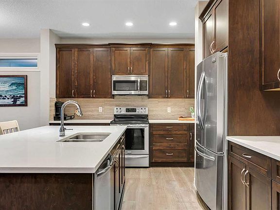 Step into this stunning 4-bedroom Trico built walkout home, offering over 3,300 sq ft of developed living space, and backing directly onto a peaceful pathway with direct access to the Mahogany wetlands—providing rare privacy and scenic views right in your own backyard. The fully fenced yard and elevated balcony make it easy to enjoy your morning coffee or take in breathtaking evening sunsets while overlooking one of the most desirable natural landscapes in the city. Inside, a grand front entry leads into a bright, open-concept main floor where expansive windows flood the kitchen, dining, and living areas with natural light. A central fireplace serves as a cozy focal point of the living room, while the kitchen features a quartz countertop island, generous counter space, and direct access to the upper balcony for effortless indoor-outdoor living. A smart walkaround layout connects seamlessly to the mudroom, attached garage, and convenient half-bath. Throughout the main floor, engineered hardwood flooring enhances the sense of flow and style. Upstairs, you'll find a spacious bonus room ideal for a media area or playroom, along with two additional bedrooms that share a full bath. The standout is the luxurious primary retreat, complete with high tray ceilings, a spa-inspired ensuite featuring a soaker tub, walk-in shower, double vanity, and a large walk-in closet. The fully finished walkout basement has been newly developed with modern style ~ which offers even more living space, including another generous great room with direct access to the backyard and the serene private pathway beyond which takes you through the various nature setting wetlands. You will also find a spacious additional bedroom with outdoor access, a 3-piece bathroom, and a built-in bar area—perfect for entertaining. For further comfort and convenience, the home has dual air-conditioning, perfect for year-round comfort! Located in the vibrant lake community of Mahogany, you can enjoy exclusive access to beaches, swimming, paddleboarding, and year-round recreation with skating as a winter seasonal hi light. With top-rated schools, shops, restaurants, and a lively community center nearby, Mahogany offers the perfect blend of nature, luxury, and convenience.