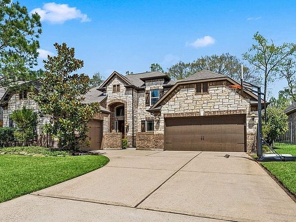 This beautiful home is a treasure that immediately draws you in with its tasteful curb appeal & 3-car split garage. Step inside where the welcoming entry sets the stage for the home's continued sophistication with a formal dining room, 2nd bedroom downstairs and an office w/ coffered ceilings. The 2nd floor features a generous game room, large pre-wired media room, 3 secondary bedrooms & 2 full bathrooms. The primary suite offers a luxe setting with high ceilings & ensuite with travertine, separate vanities, soaking tub & shower. The spacious family room converses beautifully with the open island kitchen overlooking the breakfast area with easy access to the extended covered patio w/ outdoor kitchen. The breathtaking backyard features an oversized resort style pool/spa, situated on the George Mitchell Preserve with direct access to Spring Creek, Bedias Lake and some of the best mountain bike trails in the area! The backyard oasis is perfect for outdoor entertaining! Welcome home!
