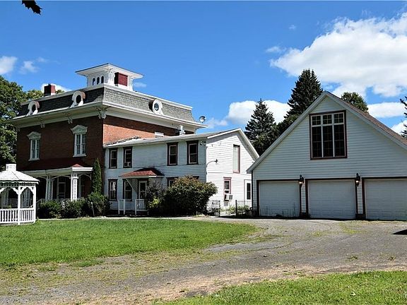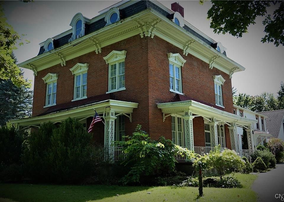 Historic four-story Victorian-Federal mansion built for a former New York governor stands on a 0.61-acre corner lot in Oneida Castle, minutes from Turning Stone Resort Casino and I-90. More than 5,370 sq ft showcase original banisters, ornate moldings, hand-carved trim, marble fireplaces, tall windows and a rooftop cupola plus modern plumbing, electrical and roofing. The grand foyer opens to gentlemen’s and ladies’ parlors, a formal dining room with built-in China closet, a massive gourmet kitchen with double gas ranges, butler’s pantry and family/breakfast room. Off the kitchen is a laundry; a covered porch and an enormous sunroom invite year-round indoor-outdoor living. A three-car carriage-house garage includes a complete apartment above, perfect for an in-law suite or rental.