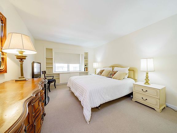 A gracious entry foyer leads into a large living room with views of the nearby tennis courts. The primary bedroom has three closets, two of which are walk-ins. The windowed dining area can be converted to a second bedroom. A bright and pristine kitchen has ample storage and pantry space and stainless steel appliances: Jenn-Aire stove, Sub-Zero refrigerator and Miele dishwasher. In addition there are attractive parquet floors throughout.