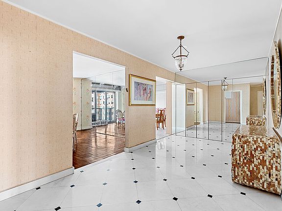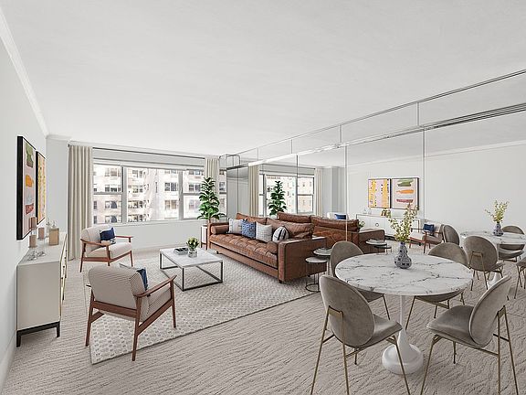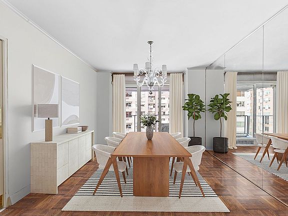 A grand gallery entrance sets the tone, featuring a discreet custom bar, perfect for entertaining. From there, step into the expansive living room, a sun-drenched space ideal for hosting or simply relaxing. The separate formal dining room easily accommodates eight to ten guests and opens onto a private east-facing terrace with serene views of the East River—perfect for enjoying your morning coffee or an evening cocktail.