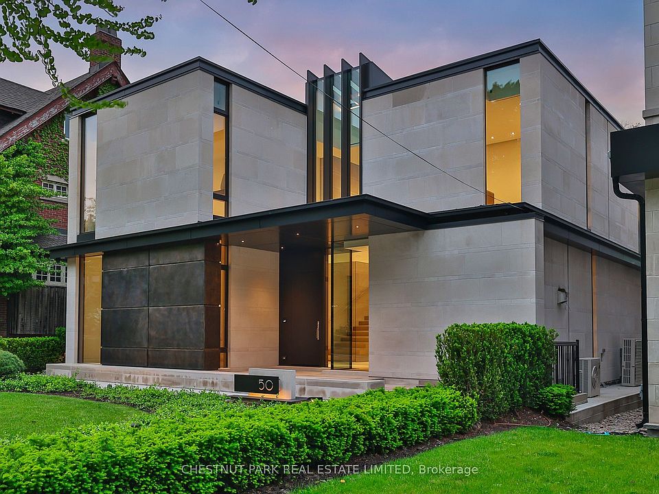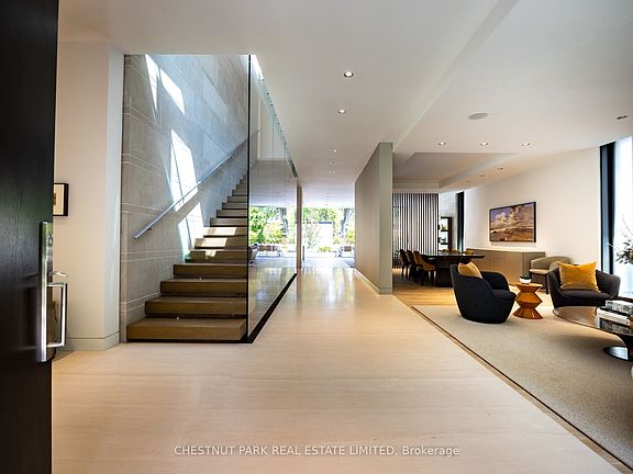 Infinity House is a masterclass in contemporary architecture - custom-built with state-of-the-art construction techniques and details to deliver a true high-performance house. This luxury home, with 4+1 bedrooms & 8 bathrooms (7,655 sf in total), offers the discerning buyer meticulously conceived interiors that harmonize natural materials with modern elements for the utmost in refined living. This coveted North Toronto location, with its unique blvd & mature tree canopy, is within walking distance to Yonge Lawrence Village & the greens of Rosedale Golf Club. Handcrafted bronze panels fronting the house signal a sublime presence on the street. The entry gallery captures the eye with a stunning living room fireplace with marble slab surround & stairs floating between soaring glass panels & a limestone wall - a true feat of engineering. Reminiscent of the exterior cladding & projecting toward the sky, this imposing feature wall intentionally serves as a central visual anchor. The optimal interior layout flows effortlessly to the professionally designed exteriors through a one-of-a-kind NanaWall of sleek glass panels, welcoming an abundance of natural light. The open concept makes clever use of a floating slat wall to create a sense of division for the dining and living rooms without compromising the bright, airy feel. The family room & adjoining chef's kitchen with pantry & servery is the hub of the home overlooking the backyard oasis with heated pool, terraces & gardens. A study, two powder rooms & a mudroom complete the main level. An elevator opens onto a light-filled 2nd floor, illuminated by custom architectural glazing & leads to 4 bedrooms, including a luxurious primary suite, 4 bathrooms & a well-appointed laundry room. An expansive lower level includes a media/recreation room, custom bar, wine cellar, exercise room with spa steam bath, nanny suite with 3-pc & a 2nd laundry room. EXTRAS: radiant floors, elevator, snowmelt, 2 car heated garage w/lower storage.