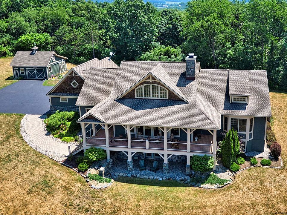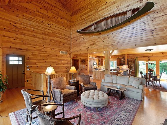 "Rustic elegance" best describes this John Witt masterpiece on 5+ exquisite acres! Vaulted ceilings, wood tones and plenty of living space provide an airy, but warm feeling to this beautifully maintained, very private home. Custom details include stone fireplace w/ antique barnwood mantle, built-in shelving/cabinetry, massive Granby stone island, 3-car garage, a 25'x30' garage/barn, wine cellar, walkout lower level and wrap around porch to enjoy incredible sunset views! The 1st flr master suite features large, his/hers walk-in closets and open, step-in shower. Relax and enjoy the perennials and nature in the screened-in porch, outdoor patio or firepit. Located just 3 miles to the entrance of Saratoga National and moments away from the Lake, Northway, Track, and downtown Saratoga Springs!