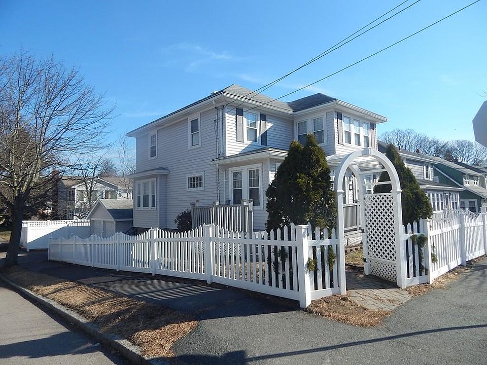 Charming 8 room,4 bed Merrymount Colonial on a nice corner lot. 1st floor has a cheery enclosed porch, a good size office/den ,Open plan living room,& dining room with lots of natural light, 1/2 bath & updated kitchen with an island (that's also portable). 2nd floor has a large master bedroom, 3 good size bedrooms & a full bath. H/W floors. 2 car garage. New furnace in 2010. Great curb appeal with white picket fencing & a wrap around trex deck to sit & enjoy the sea air & warm spring/summer days ahead. Fenced yard with bonus private lower wood deck & patio with cable hook up to relax & watch outdoor sports & movies. Great location, one block from a private association beach. Steps to the local elementary school. Close proximity to public transportation, the newly revitalized Quincy center with great restaurants, gyms & stores. Move in & enjoy adding your own personal touch to this great family home. The property is currently rented. NOT in a flood zone!