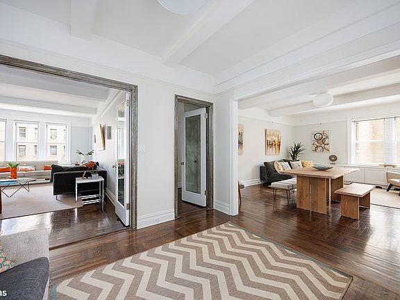 Step into a gracious entry foyer with a large coat closet and immediately you are impressed by charming pre-war details including high, beamed ceilings and beautiful hardwood floors. The foyer leads to the spacious and wide living room, which gets wonderful light from the three windows facing over double wide 96th Street. The massive dining room is an entertainer's dream, large enough to host huge dinners or use the space as both a dining room and a den. The wonderfully renovated, windowed eat-in chef's kitchen boasts a large eating area, a 6 burner Wolf range, Subzero refrigerator, Miele dishwasher, washer/dryer, and tons of storage space. It gets great Eastern light too!