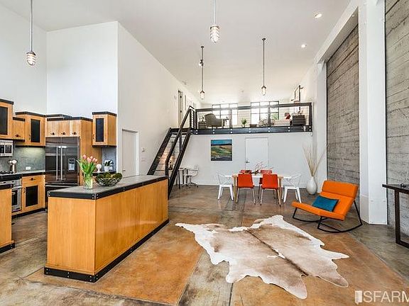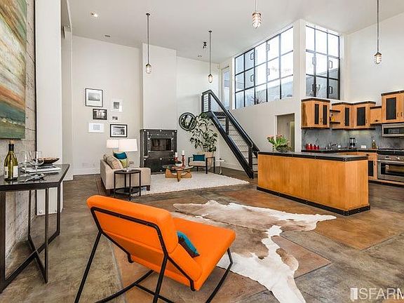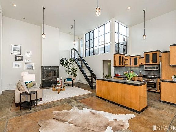 The former sprinkler factory located at 50 Washburn Street has been meticulously renovated into a loft style condominium by the renowned Martin Building Company in 1996. The large one bedroom, two-bathroom residence has soaring 20' foot ceilings and an open-air floor plan with a massive amount of volume and light. The exposed concrete floors and main wall give an industrial yet comfortable feel to the home which is accented by the wood burning fireplace in the main living area. The residence enjoys renovated baths and an updated kitchen as well as a private patio, one car parking with interior access and a large primary bedroom and bath with walk in closet. The homes central location is steps to SoMa shops, restaurants and nightlife as well as tech shuttles and access to public transit to whisk you downtown or to the outer neighborhoods and Hayes Valley's hip boutiques and restaurants are a short 10 min walk as well.