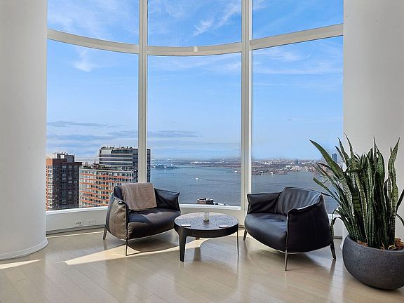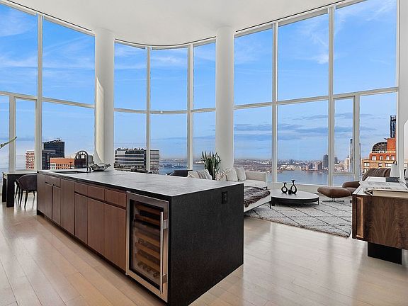This dramatic corner residence features 20 ft ceilings and striking Southwest exposure, filling the grand living room with extraordinary natural light and direct views of the Statue of Liberty. Curved, floor-to-ceiling glass brings water and harbor views into every room of this spectacular 3BR/3.5BTH home.
