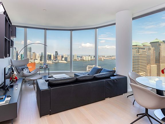 Perched high above the harbor, this two-bedroom, two-bath home features curved floor-to-ceiling windows framing breathtaking vistas of the Hudson River, New York Harbor, World Trade Center, and Statue of Liberty.